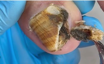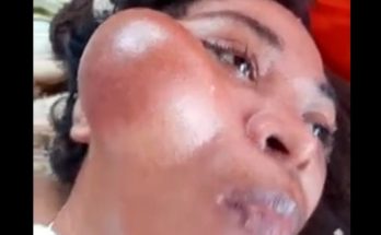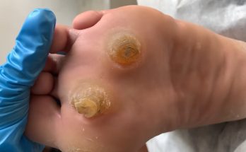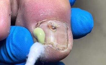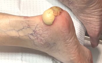 At first glance, this image shows a large, dome-shaped swelling on the knee, carefully prepared in a sterile medical setting. While it may look like a simple blister or lump, …