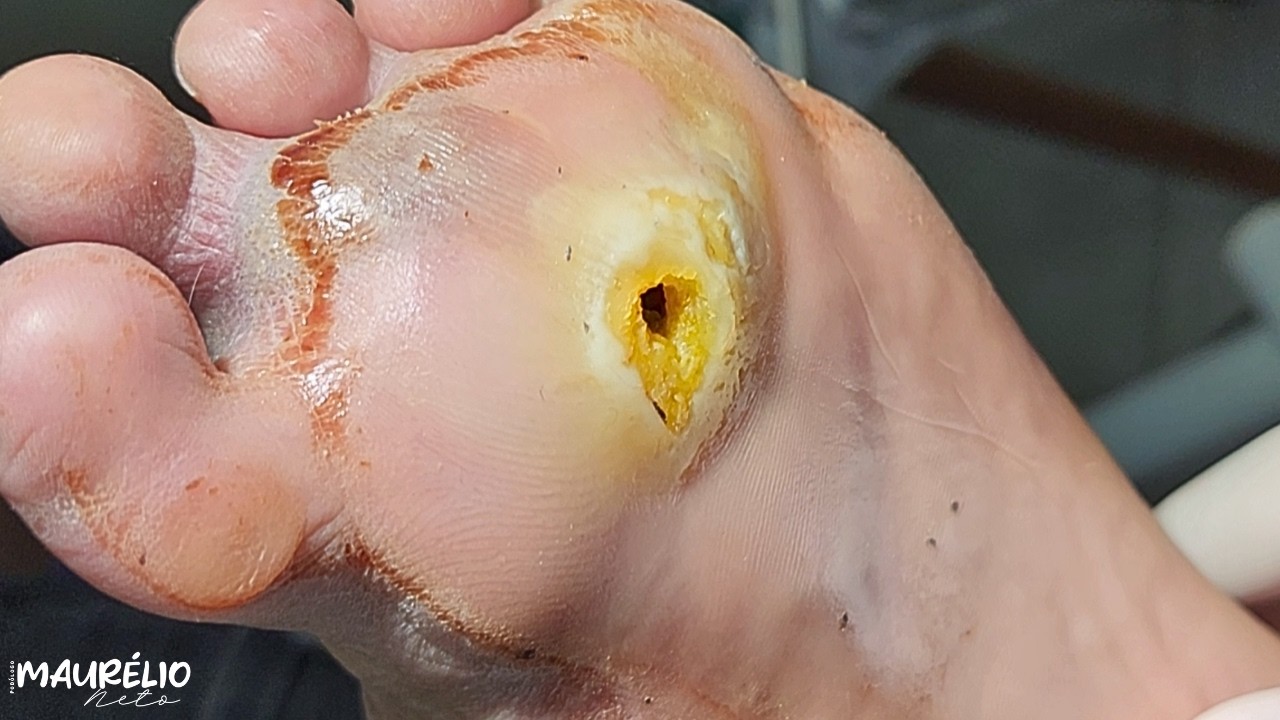 Pain, swelling, foul odor, and difficulty walking are common symptoms that accompany such a wound. Some individuals may not feel much pain, especially those with diabetic neuropathy, which reduces sensation in the feet. This can make the injury even more dangerous because the person may not notice the wound until it has already reached an advanced stage, as seen in the picture.