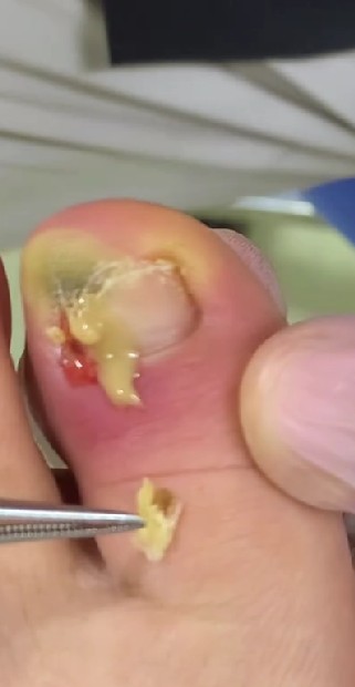 An ingrown toenail typically begins with mild discomfort, but as the nail continues to press into the soft skin, the area becomes tender and visibly swollen. When bacteria enter the irritated skin, an infection develops, leading to the accumulation of pus, which is seen as the yellow discharge in the image. This discharge is the body’s reaction to infection, trying to expel bacteria and dead tissue. The reddish color around the nail indicates inflammation, while the yellowish substance on top of the nail bed suggests localized infection that may require professional treatment.