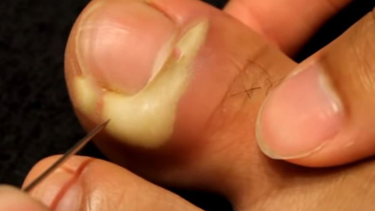 The image shows a close-up view of an inflamed toenail corner with thick yellow-white pus being drained using a sharp instrument. This appearance strongly suggests an infected ingrown toenail, a common but painful condition that happens when the nail grows into the surrounding skin. Although the process of releasing pus can bring relief, dealing with ingrown toenails—especially infected ones—requires careful attention, proper hygiene, and often professional treatment.