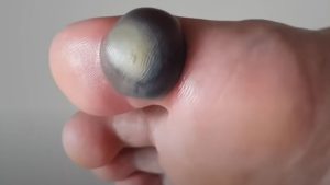In conclusion, the image illustrates a severe toe hematoma that likely resulted from trapped blood beneath the skin or nail. While often not dangerous, its size and tension suggest that medical treatment may be needed to relieve pressure and prevent further issues. Understanding the causes, treatment options, and warning signs helps ensure safe recovery and protects foot health in the future.