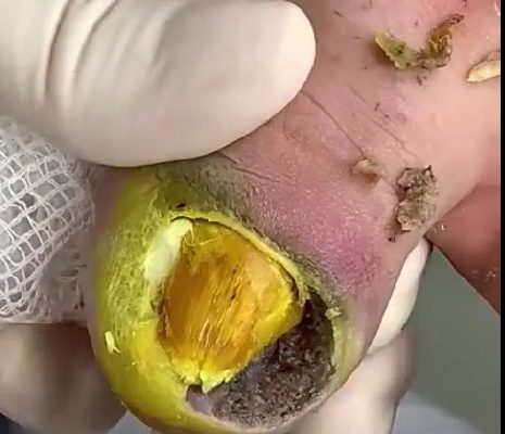 The image above shows a dangerously advanced toe infection, where the nail and surrounding tissue have been severely damaged by bacteria. The yellow, green, and dark areas visible around the nail indicate the presence of pus, dead tissue, and possible necrosis. This type of condition is far more serious than a simple ingrown toenail and requires immediate medical care.