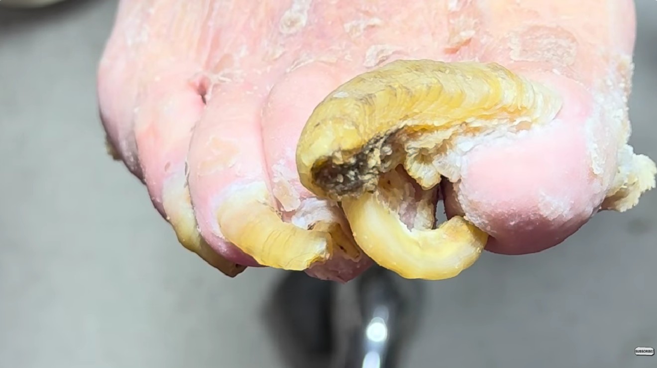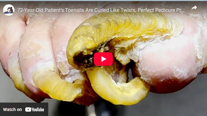 This Video shows one of the most severe toenail conditions you will ever see. Thick, yellow, curled, and hardened like a claw, these nails have grown out of control over many years. This condition, known as onychogryphosis, is often caused by long-term fungal infection, poor circulation, and lack of proper foot care.