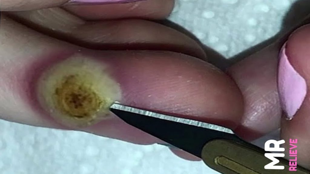 At first glance, the image above may look like a small skin problem, but don’t be fooled by its size. A round, yellowish lesion with a dark center sits on the finger, surrounded by irritated skin. A sharp medical tool is positioned just above it, signaling that removal is about to begin. What looks simple on the surface often turns out to be far more complicated — and that’s exactly why this video is so fascinating to watch.