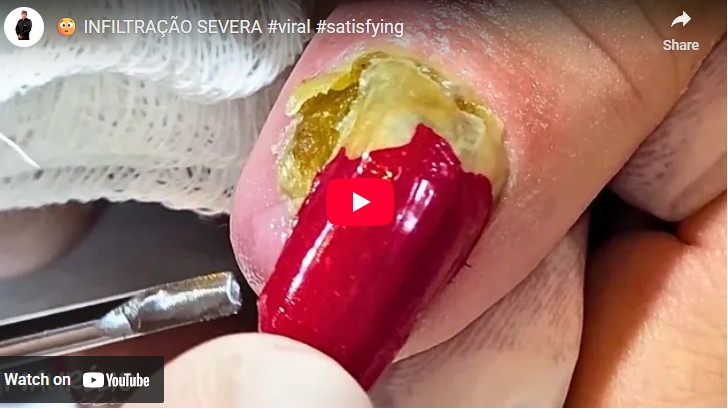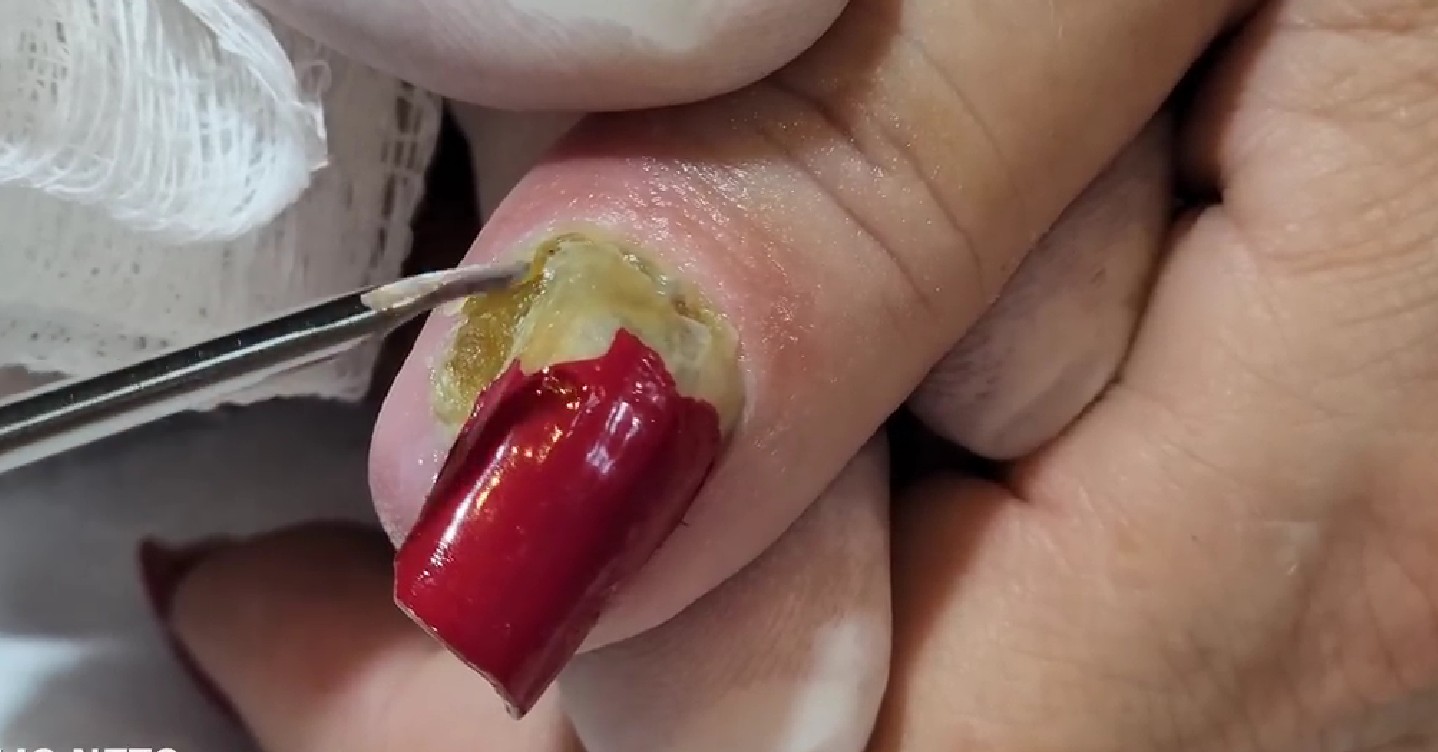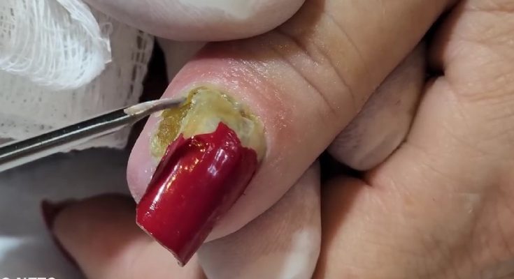 The images above reveal a condition many people don’t expect to see beneath artificial nails. At first glance, the red acrylic nail looks polished and well-shaped. But once the nail enhancement is lifted, a thick yellow-green buildup underneath becomes visible, exposing a painful and potentially dangerous nail infection.