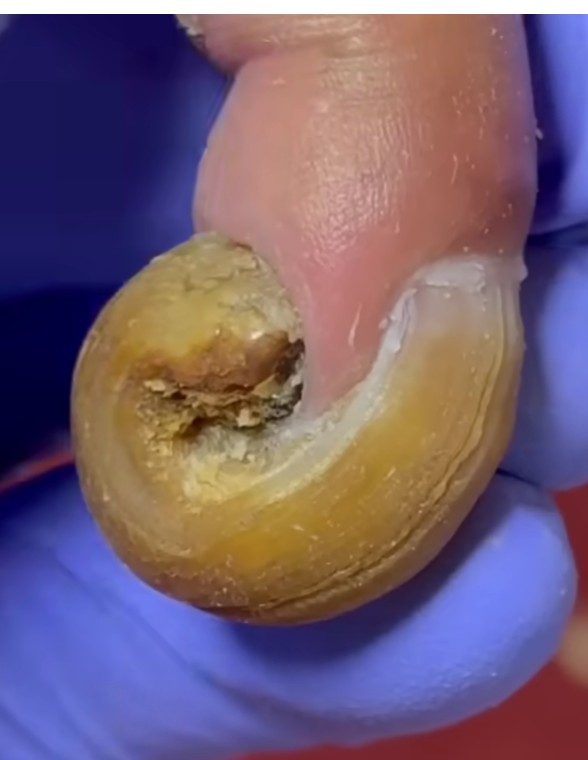 At first glance, the images above are both fascinating and unsettling. The toenail is extremely thick, yellow-brown in color, and curled inward like a claw. Layers of hardened debris have built up beneath the nail, creating pressure against the surrounding skin. This is not a simple nail problem — it is a severe nail deformity that has developed over a long period of time.