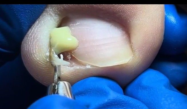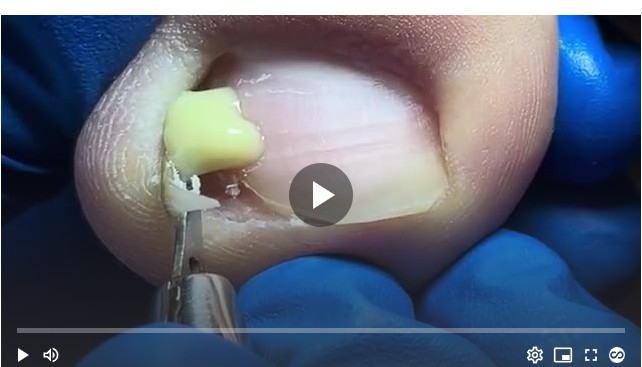 The video linked to this image shows the precise professional technique used to relieve pressure and safely remove the infected portion of the nail. Viewers will see: