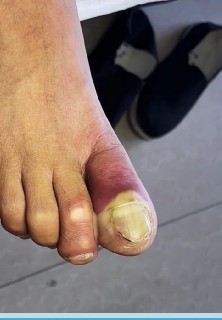 At first glance, this may look like a simple swollen toe — but the redness, tension, and visible pus clearly indicate a serious infected ingrown toenail. When the edge of the nail grows into the surrounding skin, bacteria can enter the wound and lead to paronychia or abscess formation.