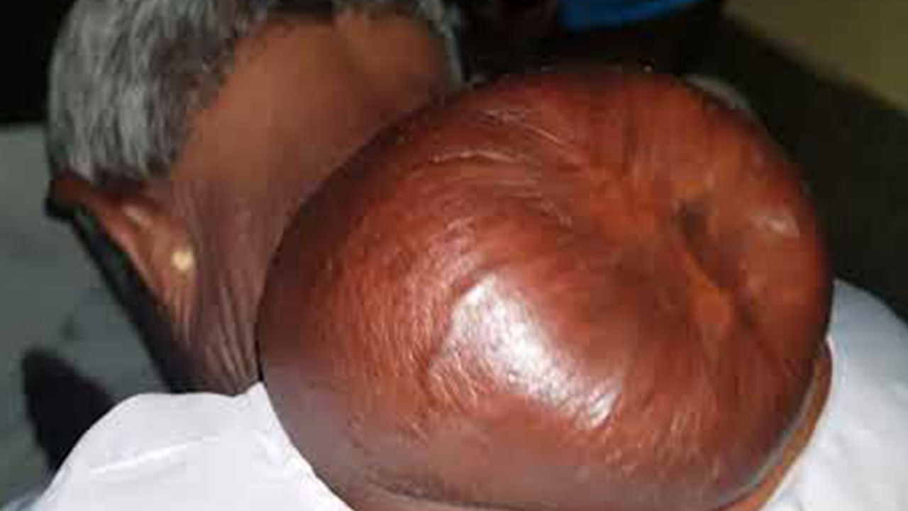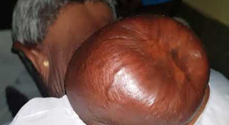The image shows an extremely large swelling on the back of a man’s head, likely caused by a massive cyst, lipoma, or other soft-tissue growth beneath the scalp. Conditions like this can develop slowly over many years, often without pain at first, until the size becomes physically uncomfortable or socially distressing.