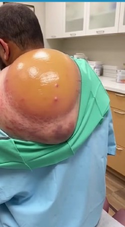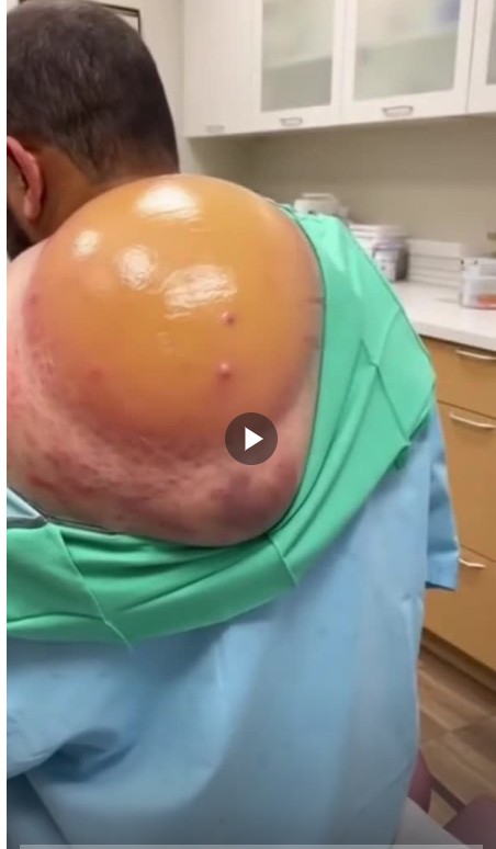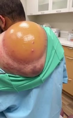 The image above shows an extremely large, swollen mass on the shoulder area, stretched tight and shiny — a classic sign of a giant cyst, lipoma, or severe abscess filled with fluid or pus. The surrounding skin appears reddened and inflamed, indicating significant pressure and possible infection beneath the surface.