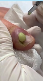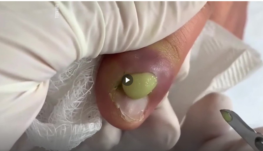 The image above shows a severely swollen toe with thick greenish pus draining from the side of the nail β a clear sign of an advanced ingrown toenail abscess. The surrounding skin appears red, tight, and inflamed, indicating significant pressure buildup beneath the surface.