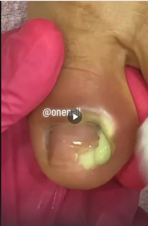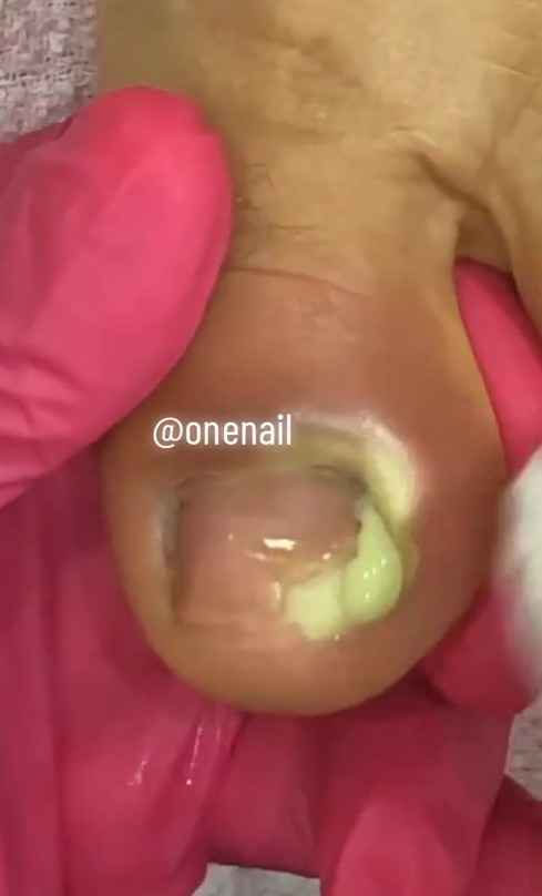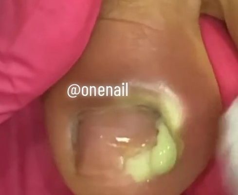 The image above shows a severely infected ingrown toenail with thick yellow-green pus draining from the side of the nail. The surrounding skin is swollen, red, and tight β clear signs of an advanced paronychia or toenail abscess.