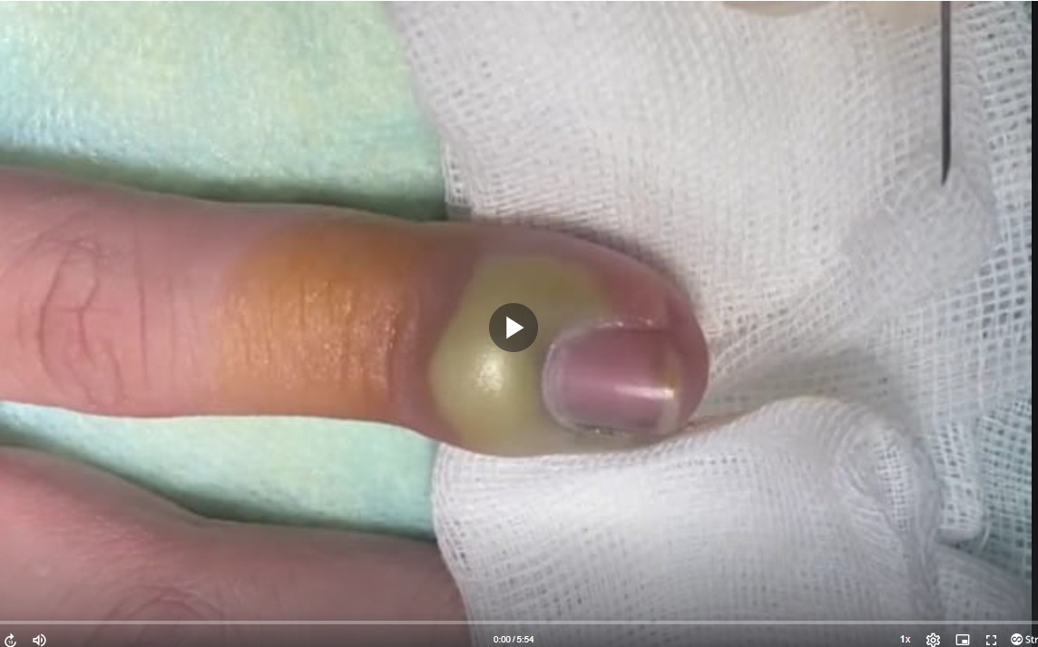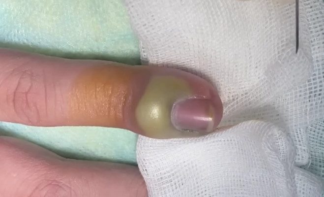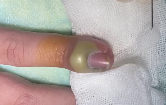 he image above shows a severely swollen finger with a large pocket of yellow-green pus under the skin near the nail. This condition is commonly known as a finger abscess or paronychia, a bacterial infection that develops around the nail or within the soft tissue of the finger.