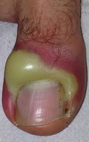 This image shows a severe case of an infected ingrown toenail, medically known as paronychia. The swollen, red skin around the nail is filled with pus — a clear sign that infection has developed beneath the surface.