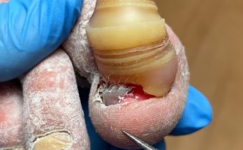 This image reveals a dramatic case of severe toenail deformity, often referred to as onychogryphosis, commonly known as a “ram’s horn nail.” The nail has grown excessively thick, curved, and …